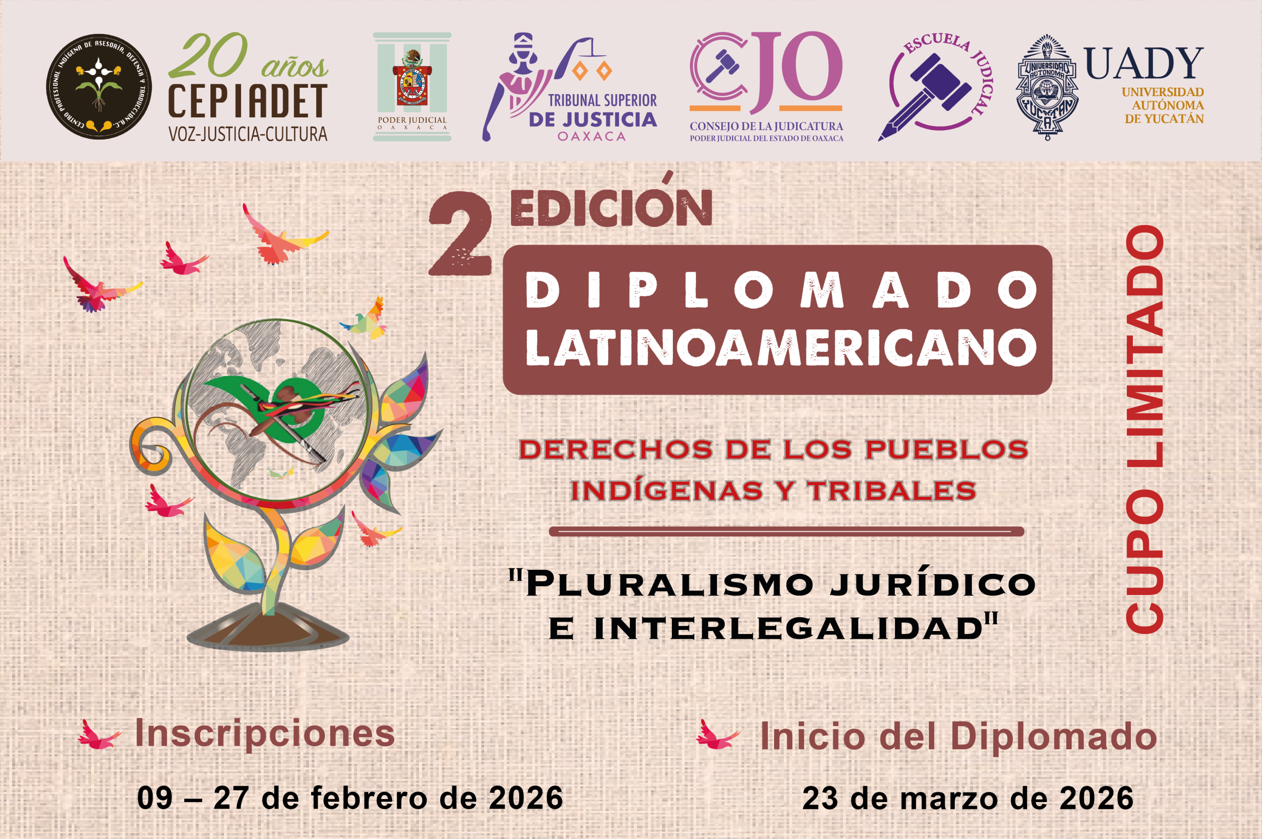 Lanzan Segunda Edición del Diplomado Latinoamericano sobre Derechos de los Pueblos Indígenas y Tribales con enfoque en pluralismo jurídico e interlegalidad Oaxaca, México, febrero de 2026. Con el objetivo de fortalecer la promoción, defensa y acompañamiento de los derechos de los Pueblos Indígenas y Tribales en América Latina, El Diplomado Latinoamericano: “Derechos de los Pueblos Indígenas y Tribales: Pluralismo Jurídico e Interlegalidad”, es convocado por el Centro Profesional Indígena de Asesoría, Defensa y Traducción A.C. (CEPIADET), la Facultad de Derecho de la Universidad Autónoma de Yucatán, el Tribunal Superior de Justicia del Estado de Oaxaca y la Escuela Judicial